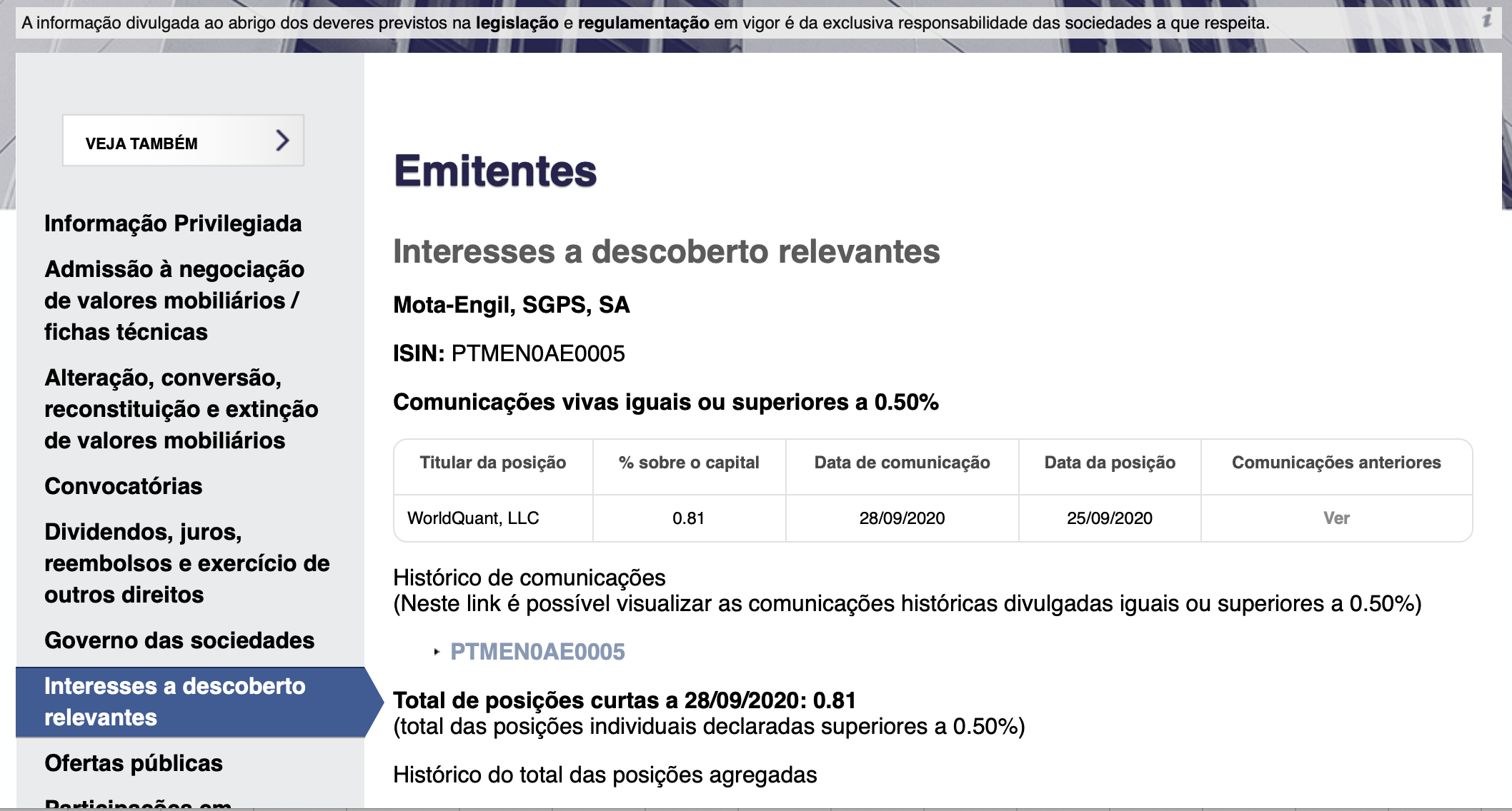 por outro lado os shortes vão incrementando as posições, estando quase fora 1.923.792 acções, o que para uma acção como a ME, é significativo, (total capital - 237,505,141 Euros - http://www.mota-engil.com/en/investors/ ... e-profile/)