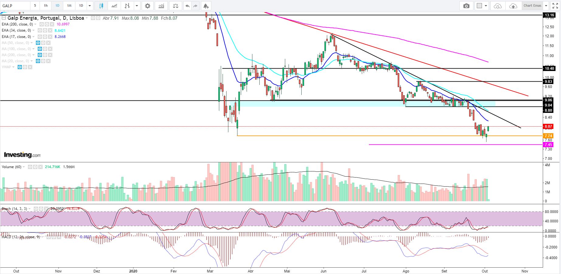 A Galp está a sentir e muito os efeitos da Pandemia; em Março tombou dos 14,50€ para os 8,30€ e nunca mais se recompôs... hoje a única coisa boa foi ter-se segurado acima barreira dos 8€. Vamos ter esperança que melhores dias virão.