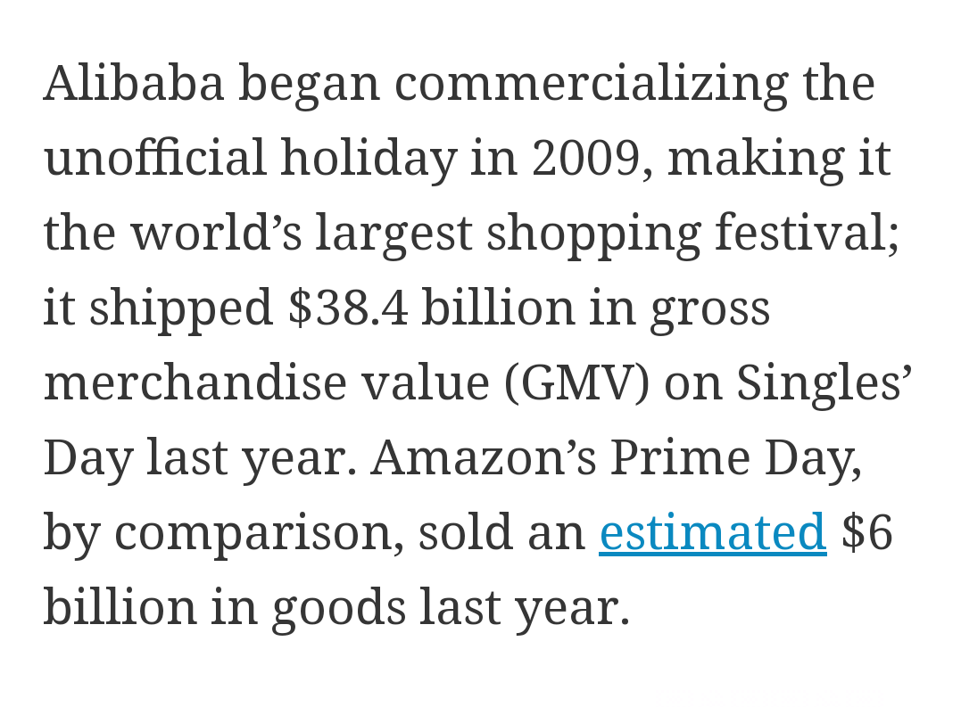 É a loucura total. O dia da loucura das compras. Vejam a diferença entre o volume de compras do Alibaba'S Singles Day e da pequena Amazon Prime Day. O Jeft Bezos mais uma vez a copiar os outros.
