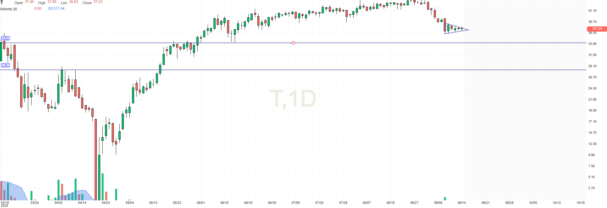 Para não fugir do tópico relativo ao oil parece que temos um triângulo que pode significar mais quedas, no limite poderia ir aos 27. Nessa zona teria sempre um suporte forte, mas duvido muito que consiga sequer quebrar os 34.