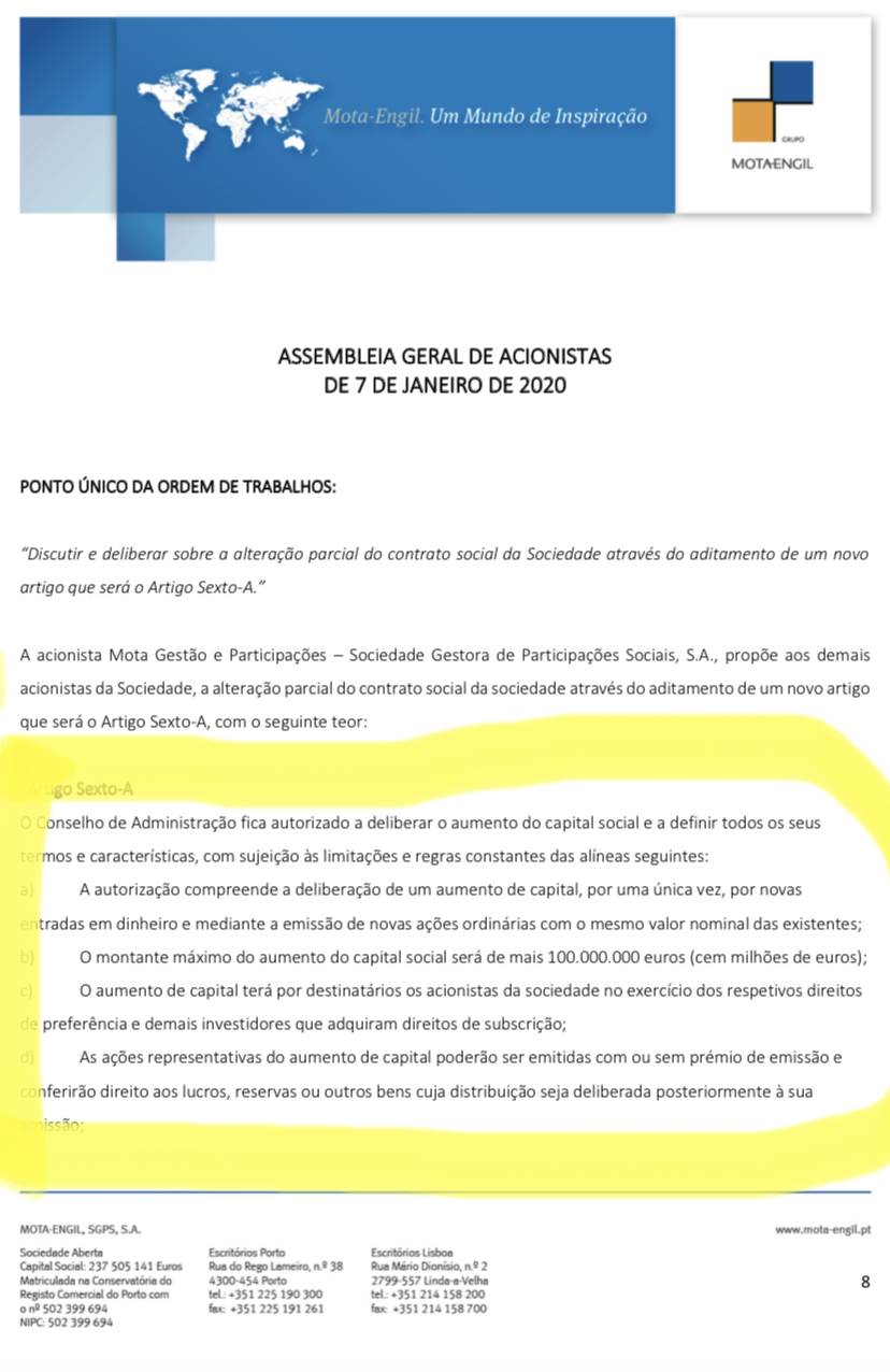 trend, o comunicado é público e está no site da Mota, mas esse paleio da incerteza foi chão que já deu uva. Então a Mota vai fazer um aumento de 100 milhões de euros, não são 100 milhões de ações. Faz sentido deixar cair o valor de cada ação? Para beneficiar quem? O que faz sentido é que suba para tornar o aumento no tal intervalo 1.40-1.60 apelativo. A probabilidade disto acontecer é que é mais certa que incerta.