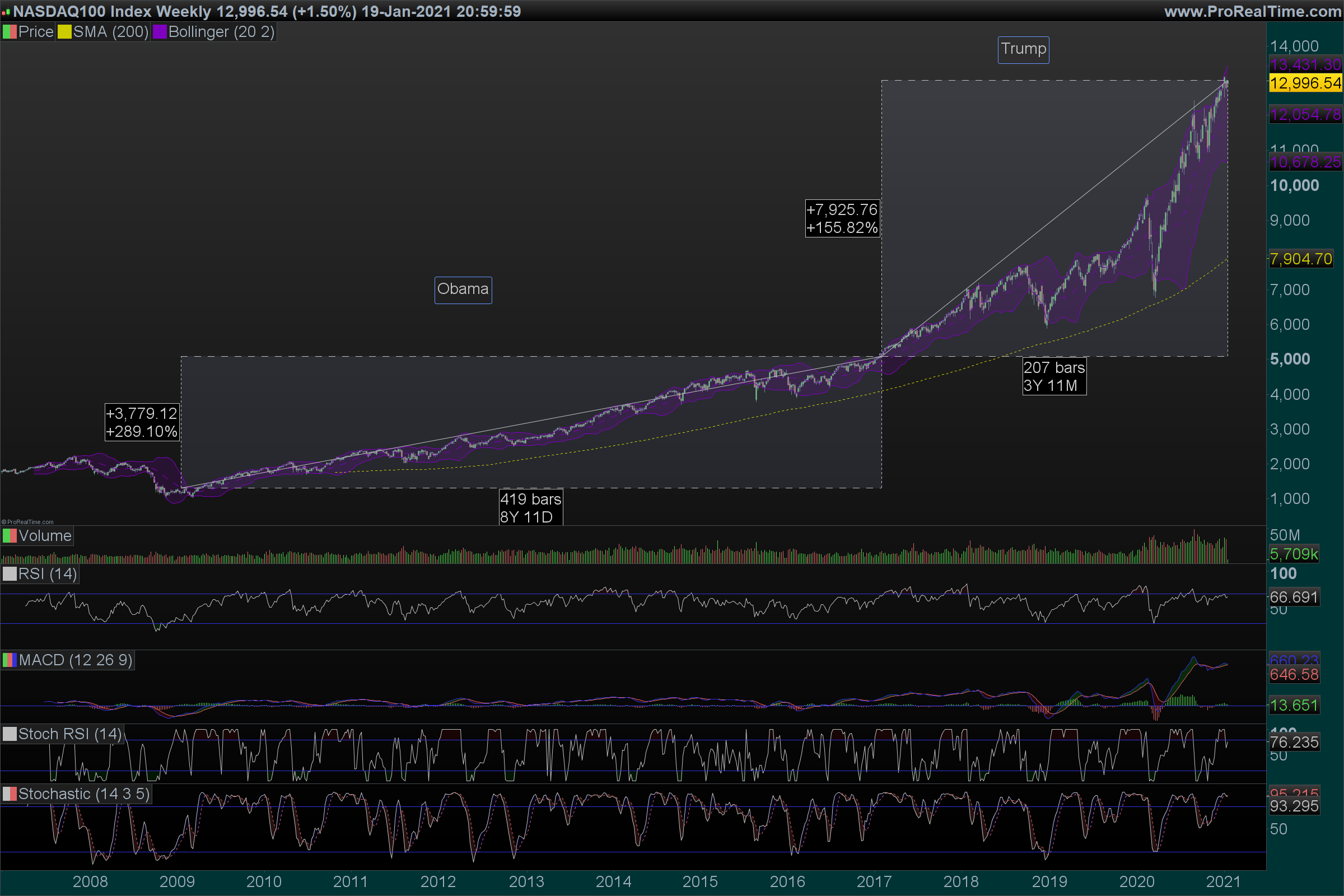 Isso não é facto nenhum, primeiro que comparas 2 mandatos de Obama com 1 de Trump e segundo que em termos de Nasdaq o Trump esteve melhor que o Obama.