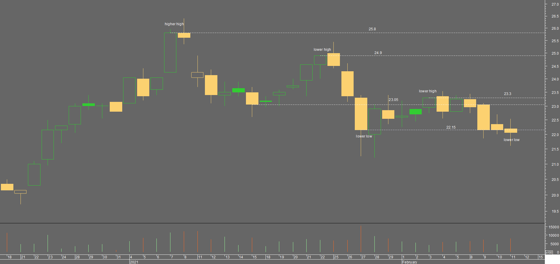 Ontem a ação fechou a perder, mas com um volume superior aos 8 dias passados. Hoje fecha, novamente, no vermelho e com um volume absurdo - o maior desde 5 de novembro de 2020! (Nota que existiu um comportamento idêntico nos dias 26 e 27 de janeiro.)