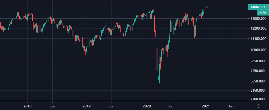 No dia, verifica-se alguma dificuldade em aproximar-se dos 14000, e cada vez que chega perto, cai logo um pouco. Os números redondos pelos vistos ainda servem de referência.