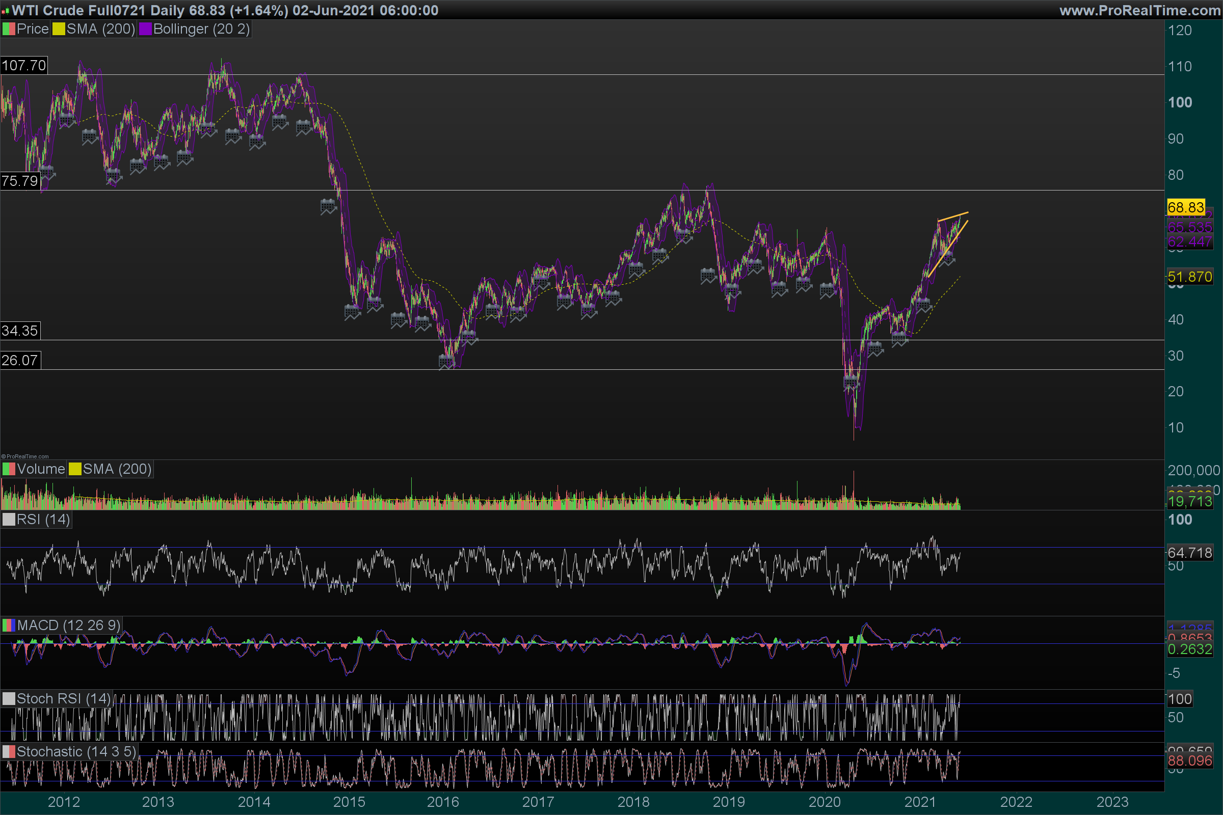 "The trend is your friend!" (adiciono ao "dogma": The long term trend is your friend...until it bends / (just) sell on Weakness). Deve seguir em alta, agora moderada.Sem subidas parabólicas como as de Maio 2020, mas com um spike eventual por conflito no Médio Oriente, tremor de terra USA, e com as habituais variações com as notícias da produção e dos stocks de crude oil.