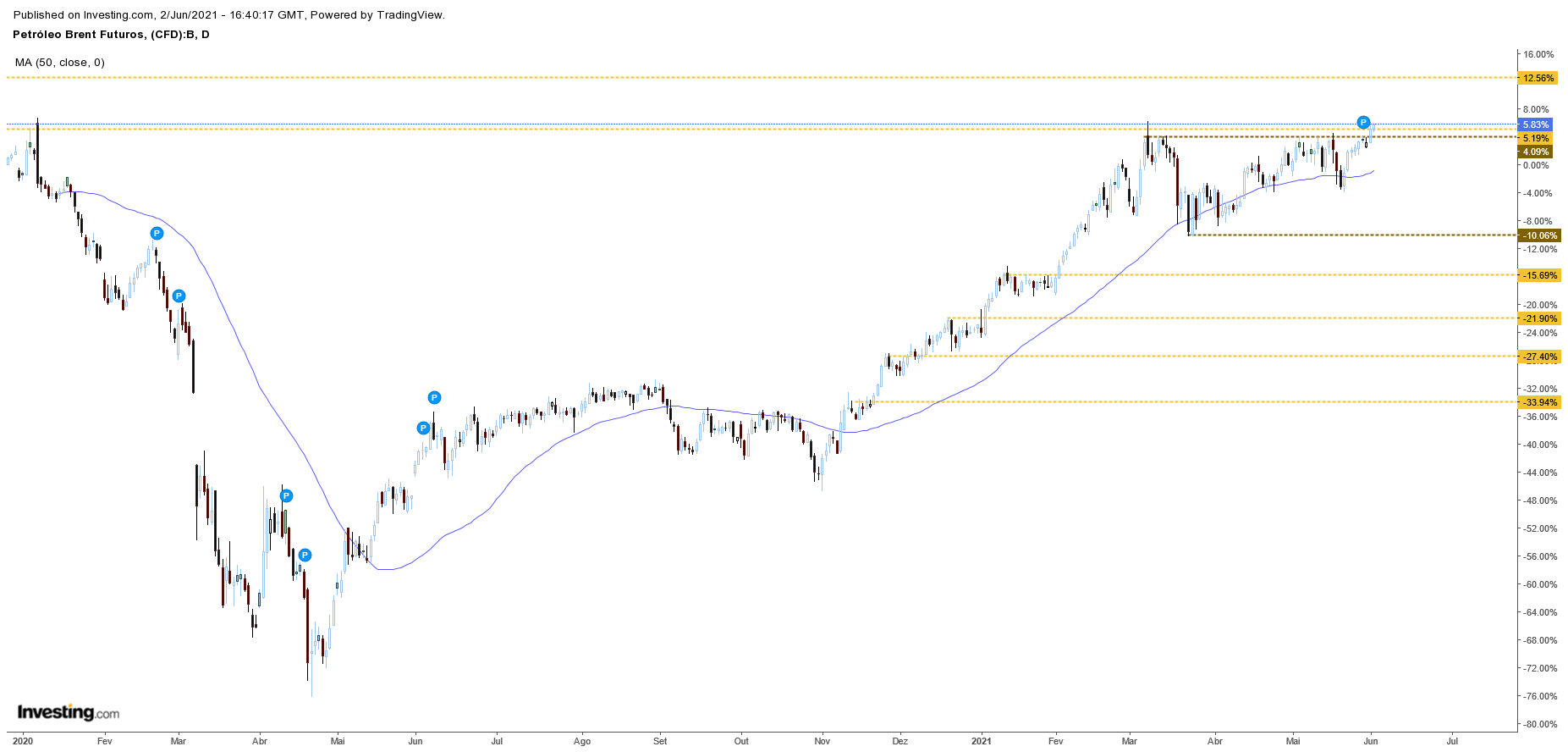 "The trend is your friend!" (adiciono ao "dogma": The long term trend is your friend...until it bends / (just) sell on Weakness). Deve seguir em alta, agora moderada.Sem subidas parabólicas como as de Maio 2020, mas com um spike eventual por conflito no Médio Oriente, tremor de terra USA, e com as habituais variações com as notícias da produção e dos stocks de crude oil.