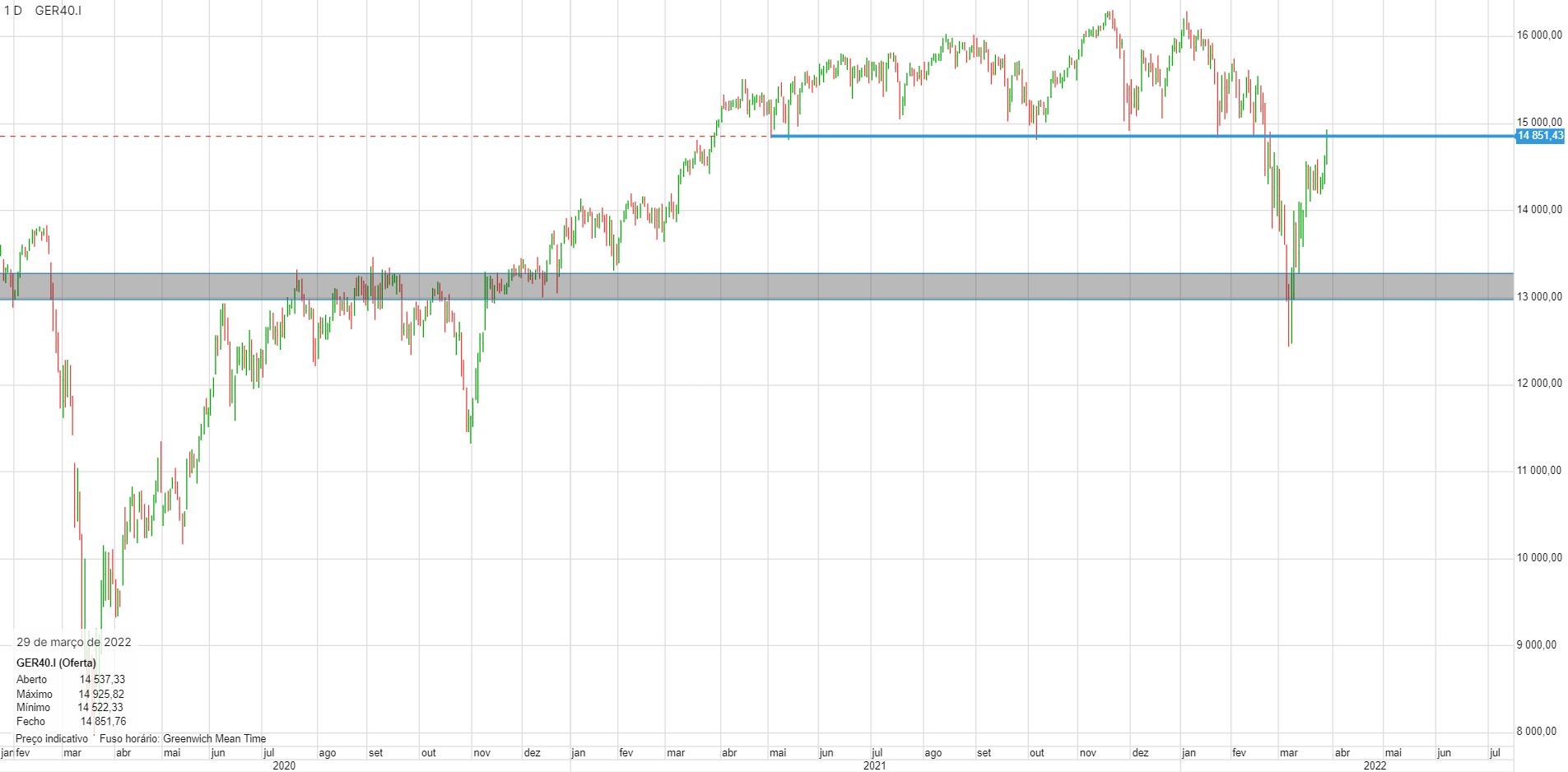 Este é o 3º toque na zona dos 13000, que foi onde o indice andou desde 2017. No Dax, prognósticos só no fim do jogo.