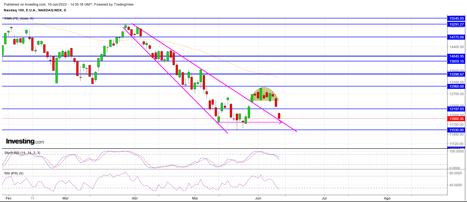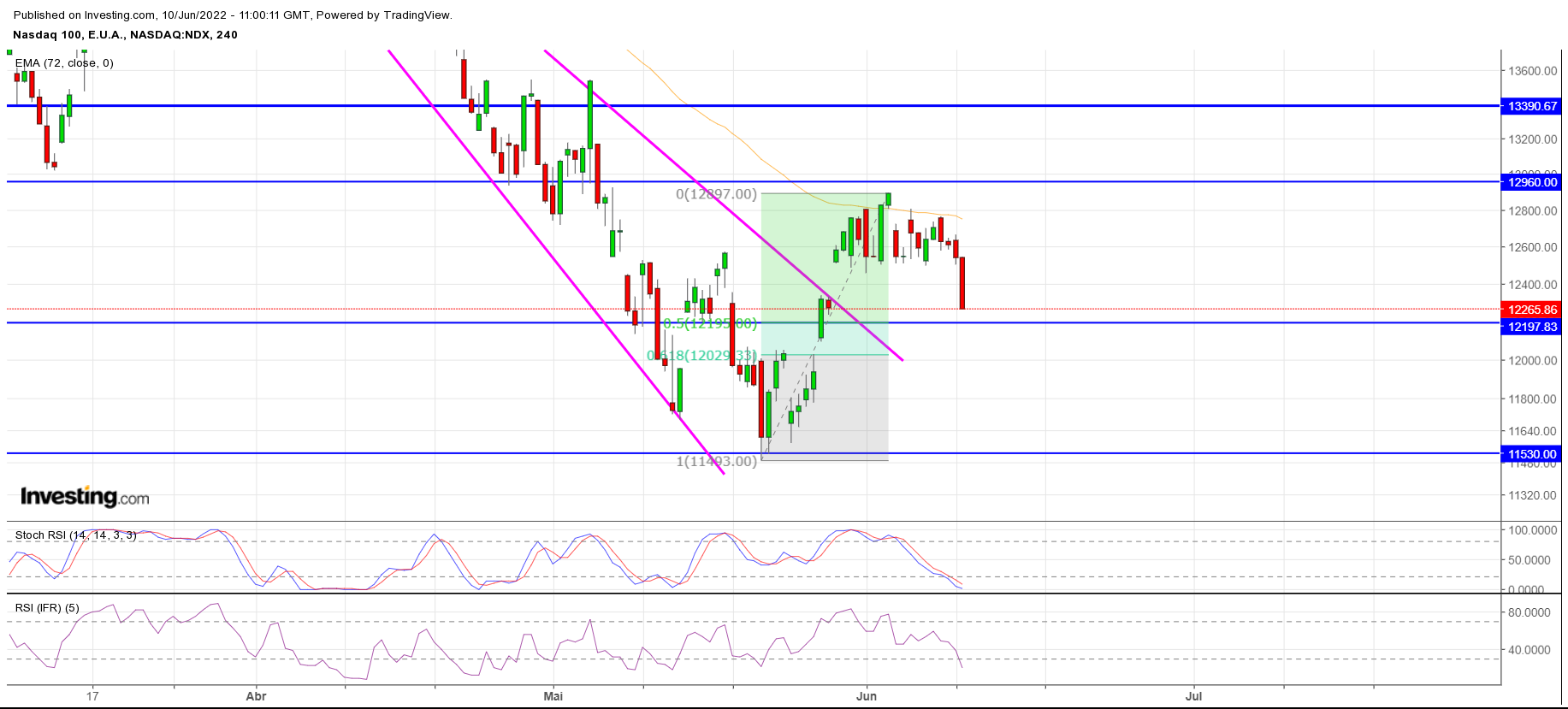 Pessoalmente colocaria o stop nos 12450, até porque nos 12200 pode fazer um bounce up (aqui até arriscaria uma entrada longa novamente, excepto se inflação a dois dígitos ou algo assim). Em Elliott o abc corretivo (e tudo em abcs) ainda tecnicamente válido, encontrando-nos na b)