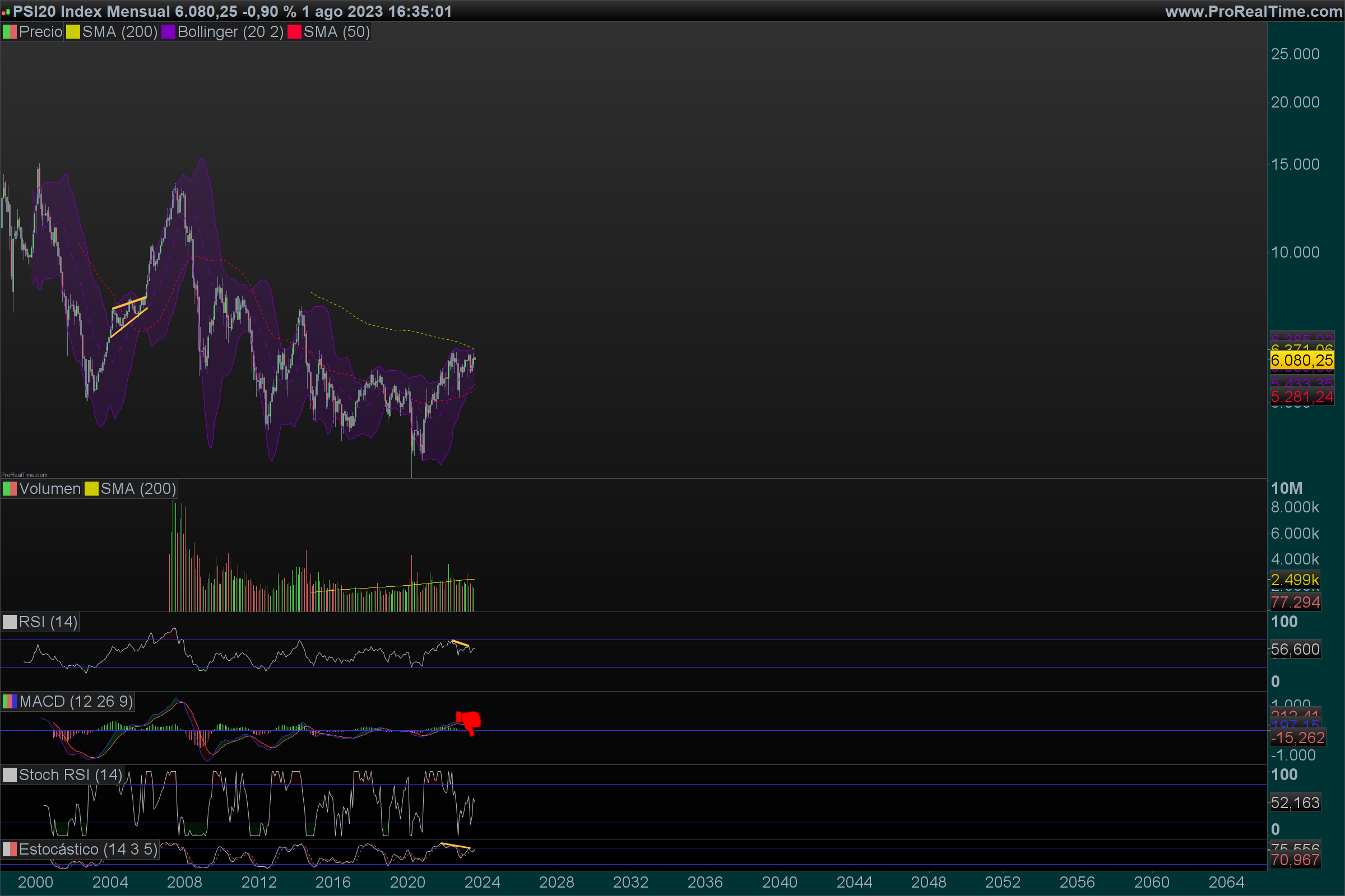 Neste momento, o PSI 20 está na seta laranja de 2023, que corresponde à seta laranja de 2005, e acho que pode subir até à linha laranja, onde está a seta azul. Coloquei na seta azul o valor de 7767, foi uma pequena projeção que fiz, mas o valor não tem muita relevância e é só para dar uma ideia do que acho que pode subir.