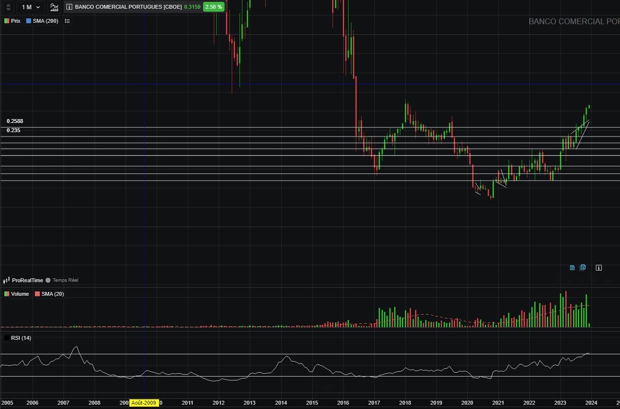 Análise Fundamental - Apresentação de resultados a 30.10.2023 com bom lucro e excelentes números. Fecho do ano de 2023 prevê-se também que progrida na mesma linha. O Bank Millennium com imenso potencial na Polónia, parece ter estancado o problema das hipotecas em francos suíços e irá também reforçar o seu contributo para os lucros nos próximos anos. Distruição de dividendos e muito potencial para divulgar boas notícias "trigers" positivos para a valorização da cotação.