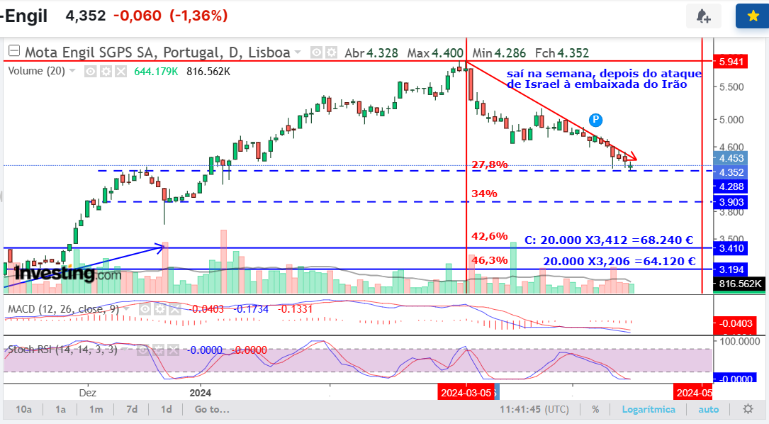 Com a Guerra em Israel e no Irão, a incerteza de o escalar da guerra, com a noticia que Israel vai retaliar, não havera duvidas, infelizmente, que o destino da Mota será descer ate ao suporte, falta saber qual!!!! apesar dos bons resultados os fundamentais internacionais, neste momento serão relevantes....