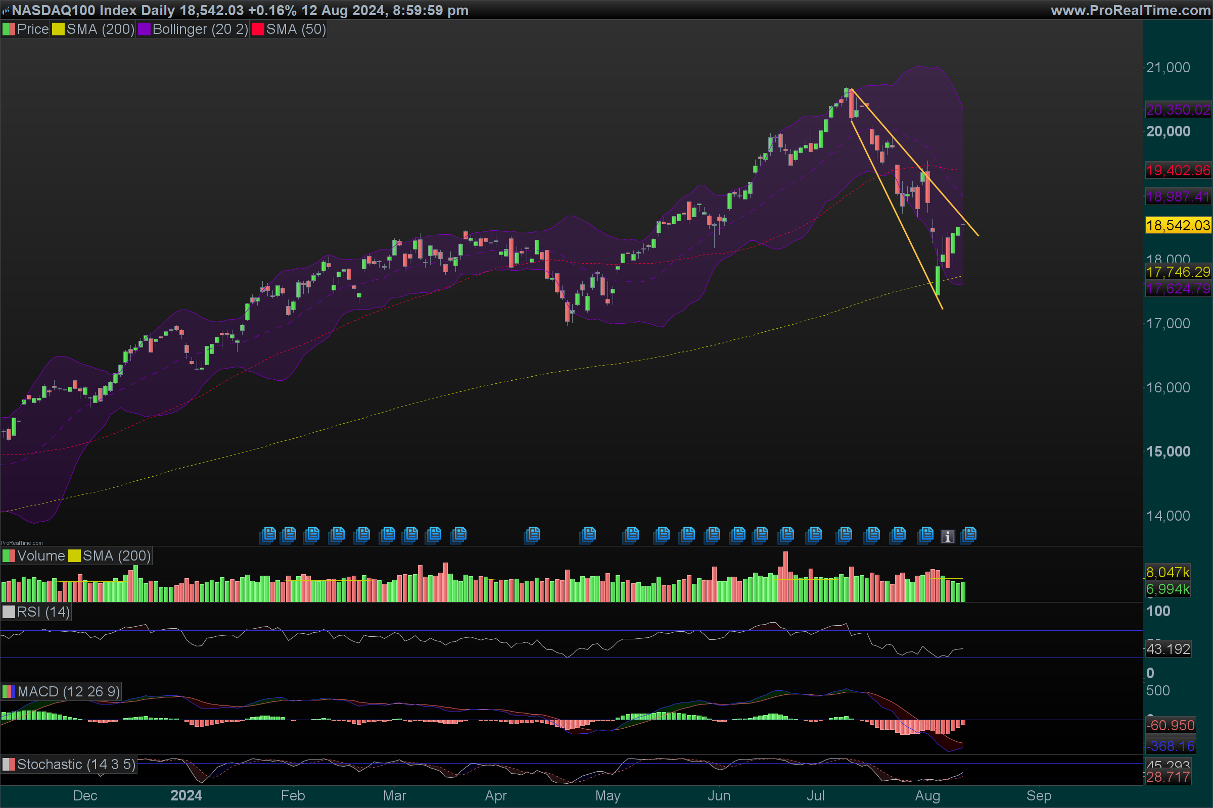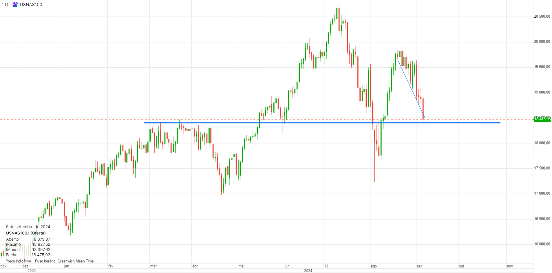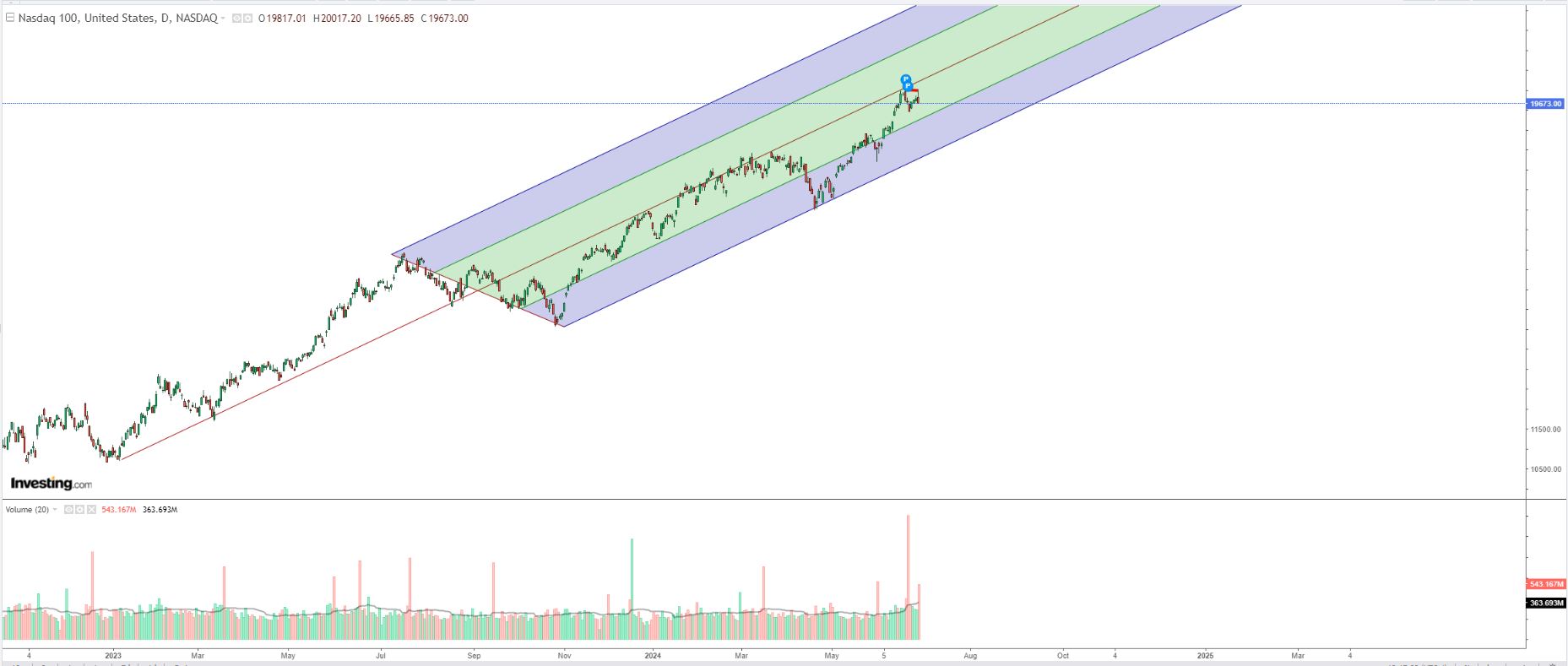 O interessante. e que eu já tinha referido, mas sem grande convicção, é que este canal descendente é uma consolidação da subida anterior, neste caso uma bandeira. Tecnicamente está perfeito, e as bandeiras acontecem frequentemente a meio do movimento, que seja em amplitude quer seja em tempo. Se assim for, isso projeta o indice para os 20000 no final de 2024.