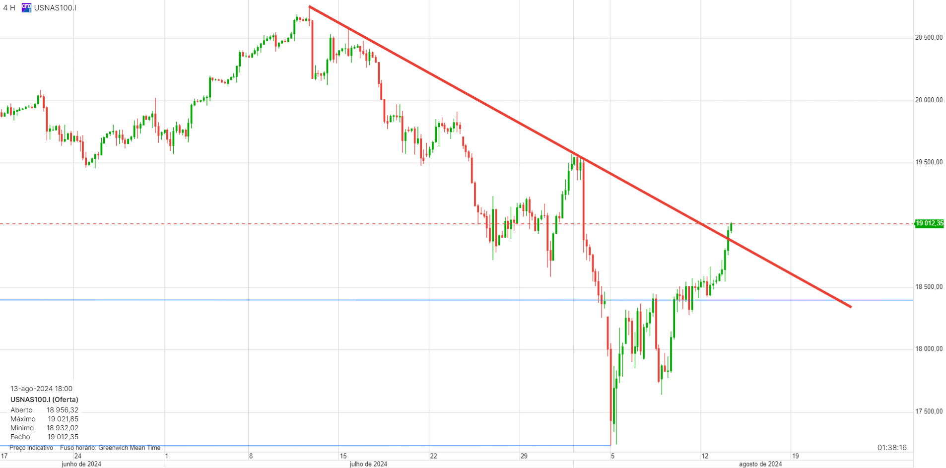 Entrada curta nos 19000, porque isto poderá ser um "reteste" à LT ascendente quebrada ( a verde no diário) Como se não bastasse isso, no gráfico de 4 horas há um teste a uma linha de tendência descendente ( a vermelho - já quebrou um pouco, mas é aceitável)..