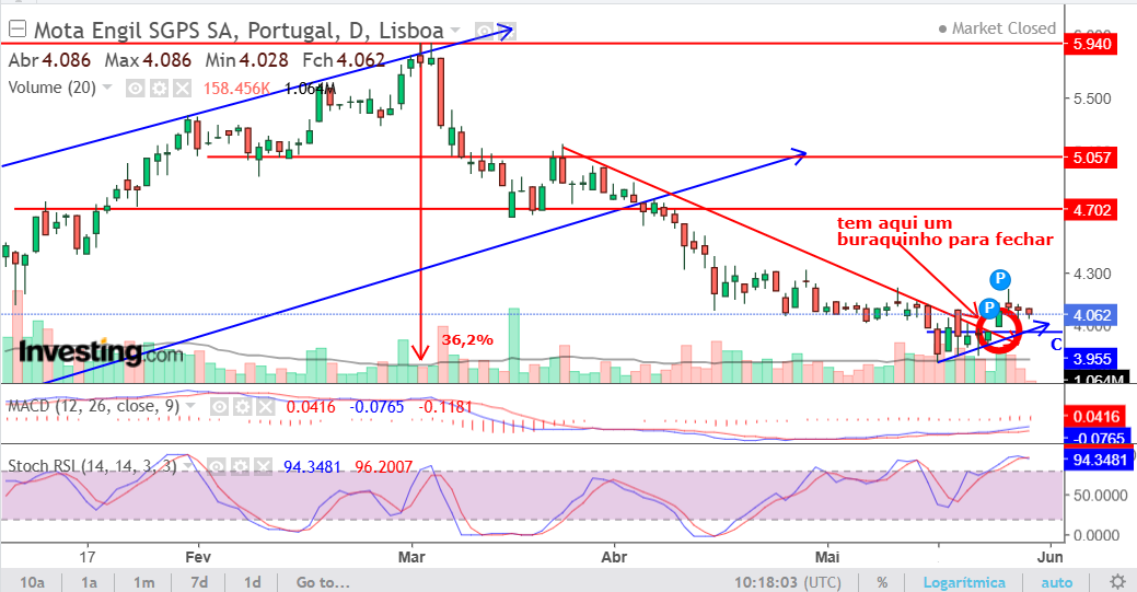 Mas o "buraquinho" não está pelos 4 ? E hoje o minimo não foi precisamente 4 ? Não se encontrará neste momento em cima de um suporte ? E simultaneamente em cima da nova LTA em formação ? Tendo esta conjugação tudo para ir para cima ?