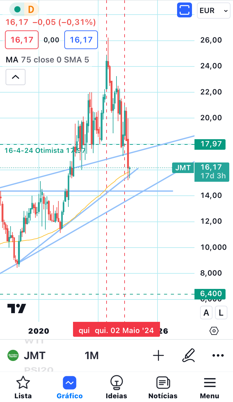 No gráfico mensal da JMT parece que há indicadores de momentum que caíram muito menos que o preço. Isso pode ser uma divergência positiva e indicar uma possível inversão próxima ou então descer com menos intensidade. Acho que se pode ver nos próximos dias ou semanas se o preço consegue ir para cima do valor que referi da média móvel e manter-se acima ou se não consegue. Neste momento está em baixo. Não sei o que vai acontecer.