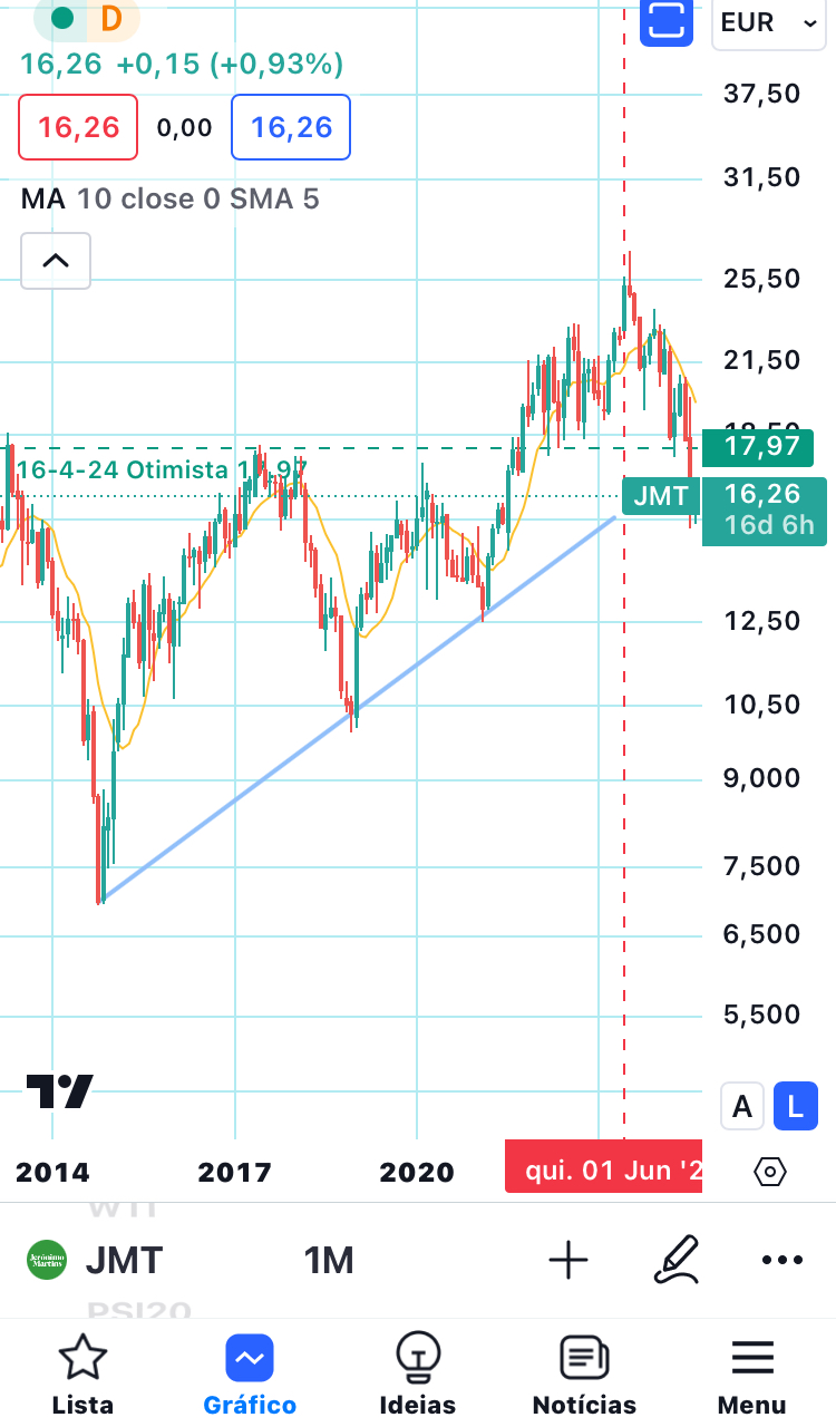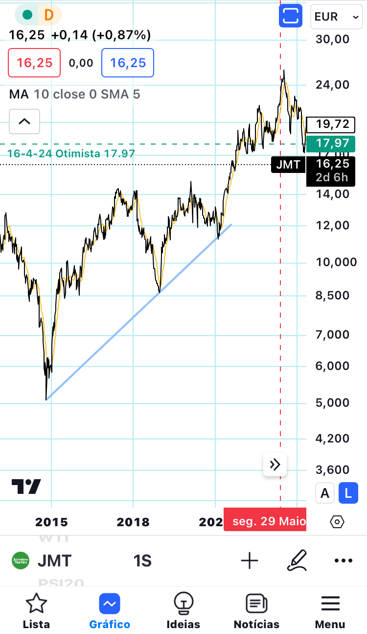 A JMT está a subir hoje. Disse duas médias móveis que podiam servir como suporte e expliquei como chegar a elas. Disse também que uma estava a 15,47, que era a que estava mais próxima do preço. Ontem de manhã achava que o fim do mês era ontem, mas é hoje. Mas como disse havia duas e só disse o valor da que estava mais perto do preço, a outra está a 15,69. A cotação neste momento está acima das duas.