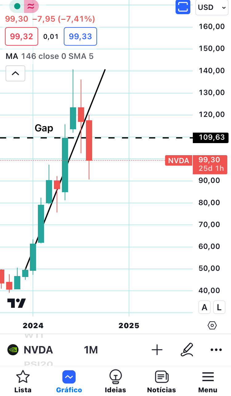 Preferia que a NVDA não fechasse acima da linha a tracejado este mês para o espaço não ficar à vista e não ficar com receio de que possa voltar a cair mais tarde, mas não sei o que vai acontecer. No entanto, acho que há a hipótese de este mês não descer mais do que desceu hoje.