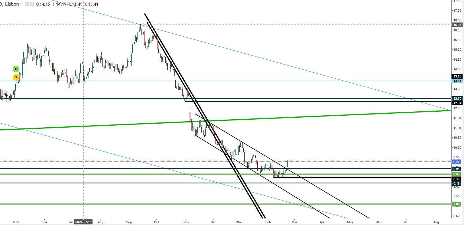 Por aqui passar 9,15 para o duplo fundo com target nos 10 e picos e depois IHS a valer 2 euros com target bem dentro dos 12s (com optimismo fechar gap dos 12,6). As zonas relevantes são análogas ao comentado na EDP, como se esperava pela correlação.