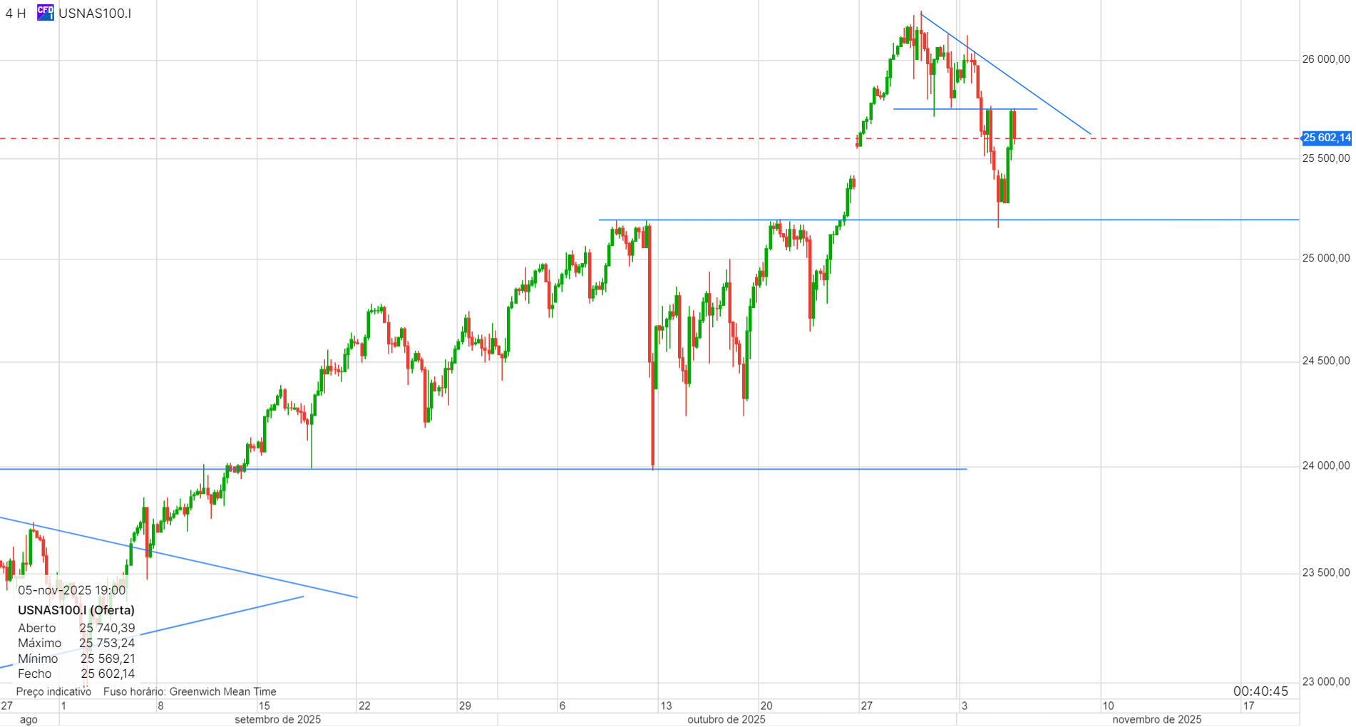 Um fecho acima dos 25900 (a linha superior do canal descendente, mais visível no gráfico de 1hora), leva o índice para novos máximos