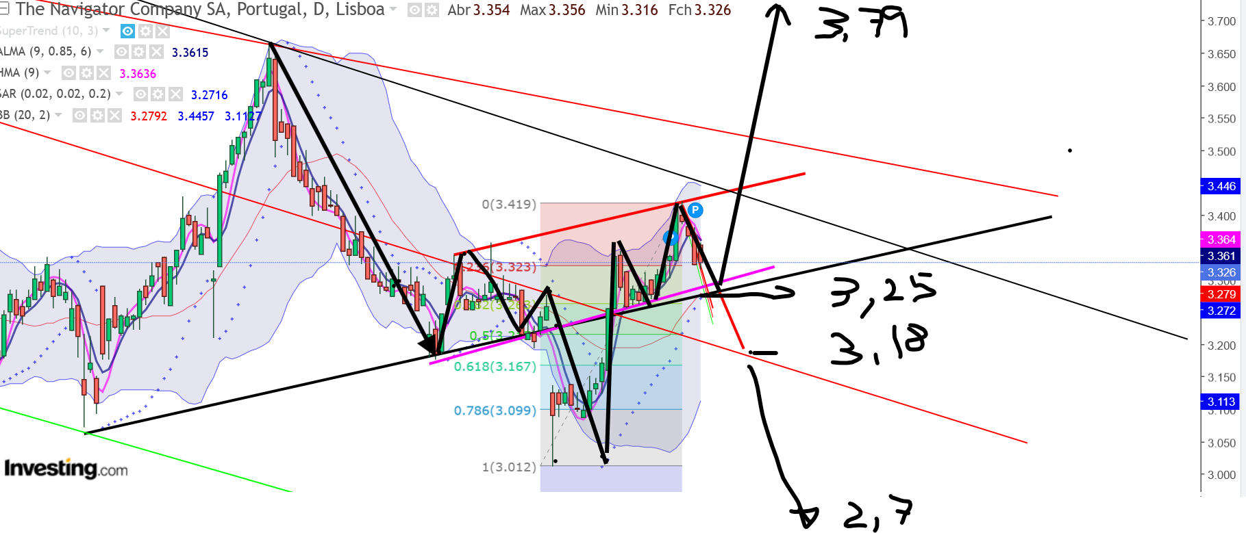 Para o meu cenario ser plausivel, o intervalo inferior que estou a considerar estaá entre os 3,3/3,25 e tireia de fechar com acima dos 3,31 ... Se romper só vejo um suporte já nos 3,14!