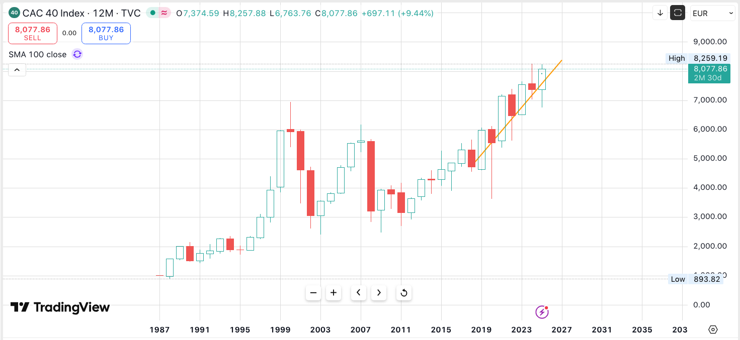 Coisas que escrevi no tópico, para ilustrar o gráfico anual do CAC40. Até escrevi muitas coisas, embora ache que podia ter ficado pelo primeiro comentário. Mas o ultimo fala tambem sobre o proximo ano. Neste momento está próximo de renovar os máximos de sempre.