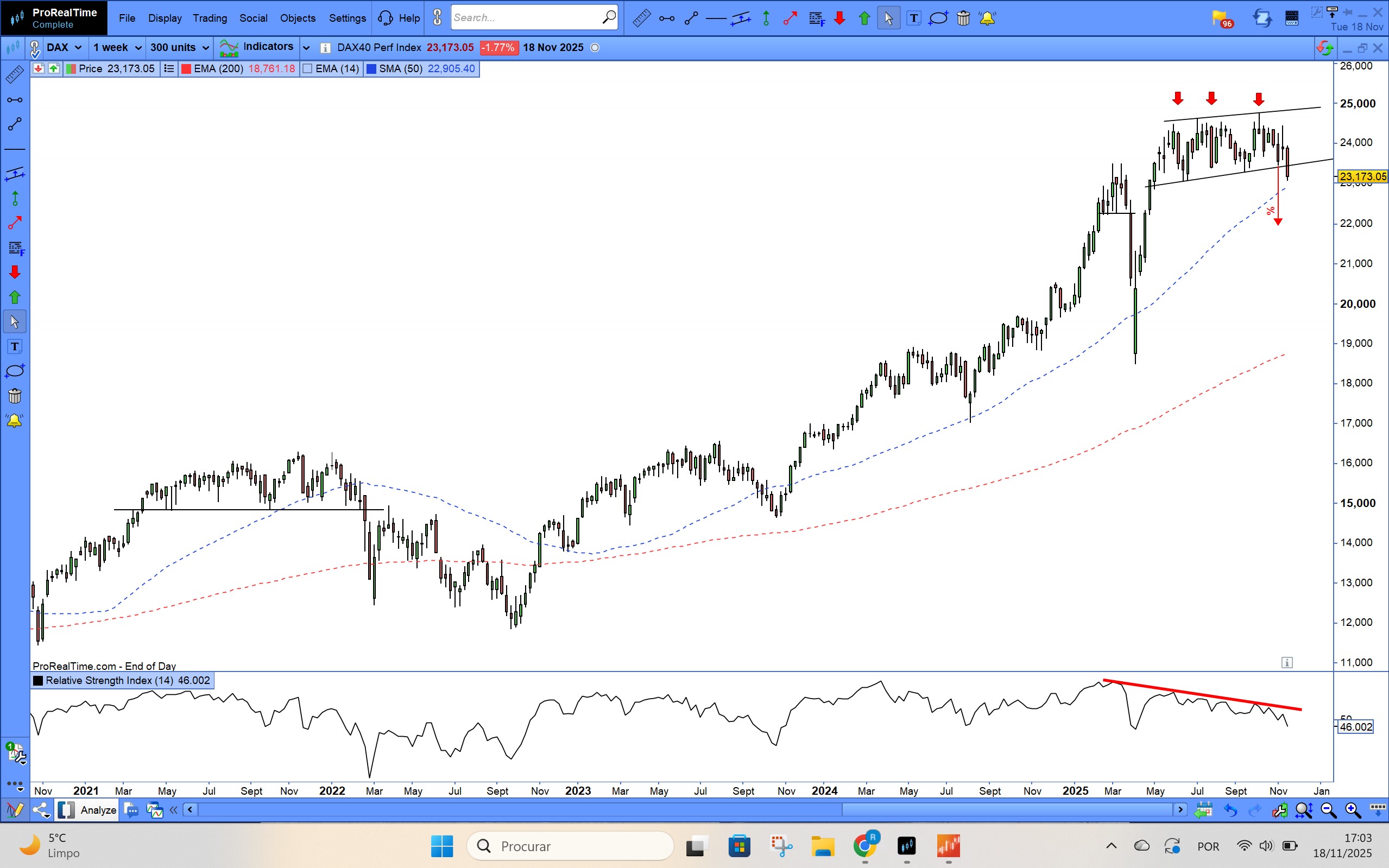 o Dax está num suporte. Depois de dois topos, que podem sempre ser um duplo topo, figura de inversão, toca pela 4ª vez no suporte. Espero que quebre, já que também estou curto. E como no Nasdaq, não fiz lucros e já tive de tudo :roll: