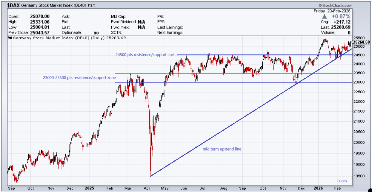 o dax encontra-se em bullish mode cotando acima da sua zona de suporte dos 24500 pts e acima da uptrend line. encontra-se a cotar acima também das suas médias móveis de 50 e 200 dias.