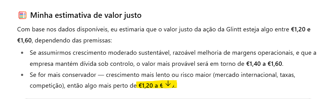 A Glintt foi bem para lá do valor justo do negócio (diria que entre os 70c e os 80c), suportada por fantasias sobre OPA e o momentum da ação (que partiu de uma base muito baixa). Pode ser que ainda dê um pequeno salto agora nas próximas semanas visto que, apesar de tudo, os resultados continuam a melhorar. Mas dada a baixa liquidez e múltiplos desajustados, a que podemos somar a crescente volatilidade do mercado, creio que ainda vamos ver uma descida de 40% ou 50% a partir dos valores atuais.