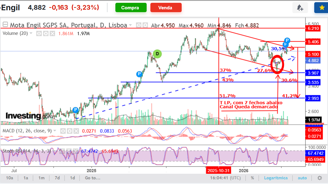 Na minha leitura, a Mota-Engil está numa fase clara de consolidação acima dos 4,90€, com sinais de absorção nessa zona. Depois da recuperação desde os 4,05€, o título está agora a ganhar força para testar novamente resistência dos 5,10€. Vejo algum suporte intermédio na zona dos 4,78€/4,67€, mas o nível que realmente importa está mais abaixo, nos 4,57€, que já provou ser suporte sólido. Enquanto se mantiver acima dessa zona, continuo a favorecer um movimento em direção aos 5,10€ no curto prazo. Para já não vejo sinais de distribuição, parece-me mais preparação para novo teste à resistência. Não me surpreendia uma aproximação aos 5,10€ ainda hoje ou nos próximos dias e, caso haja aumento de volume nessa zona, vejo boas probabilidades de quebra em alta e continuação do movimento.