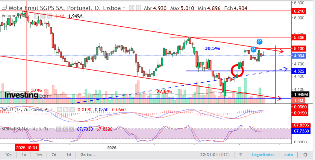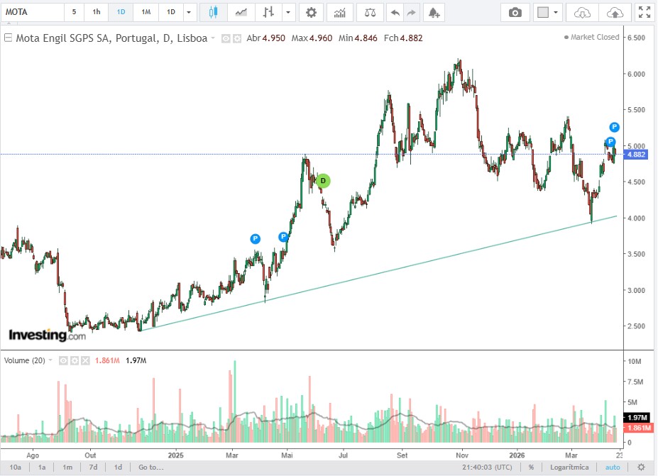 A minha ideia mantém-se: acumular até aos dividendos e dentro da margem que defini para a Mota-Engil. Não estou a correr atrás do preço, estou a construir posição.