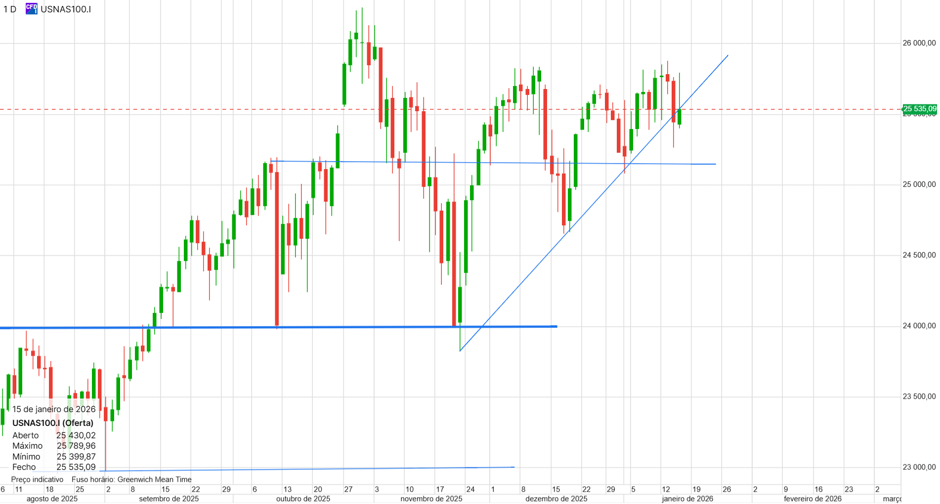 Acho que as linhas no gráfico de 4 horas fazem sentido, mas era difícil antecipar a lateralização. Acho que vai acabar por ir para cima, porque o Russell e o Dow Jones já fizeram novos máximos. Acho provável que o Nasdaq também faça, mesmo se descer na segunda e perder a linha de suporte no gráfico de 4 horas durante algumas horas ou um dia. O Nasdaq pode estar pior porque foi o que subiu mais, e há vários analistas a dizer que o impacto da IA pode não ser o esperado. No entanto, é difícil dizer se vai continuar assim ou se é momentâneo